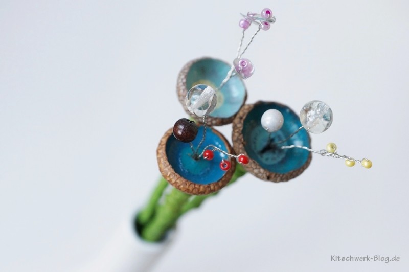 Etwas größere und einzelne Perlen ebenfalls auf Draht aufziehen und unterhalb der Perlen stramm verzwirbeln. Die Drähte von oben nach unten durch die Öffnung der Eichelhütchen